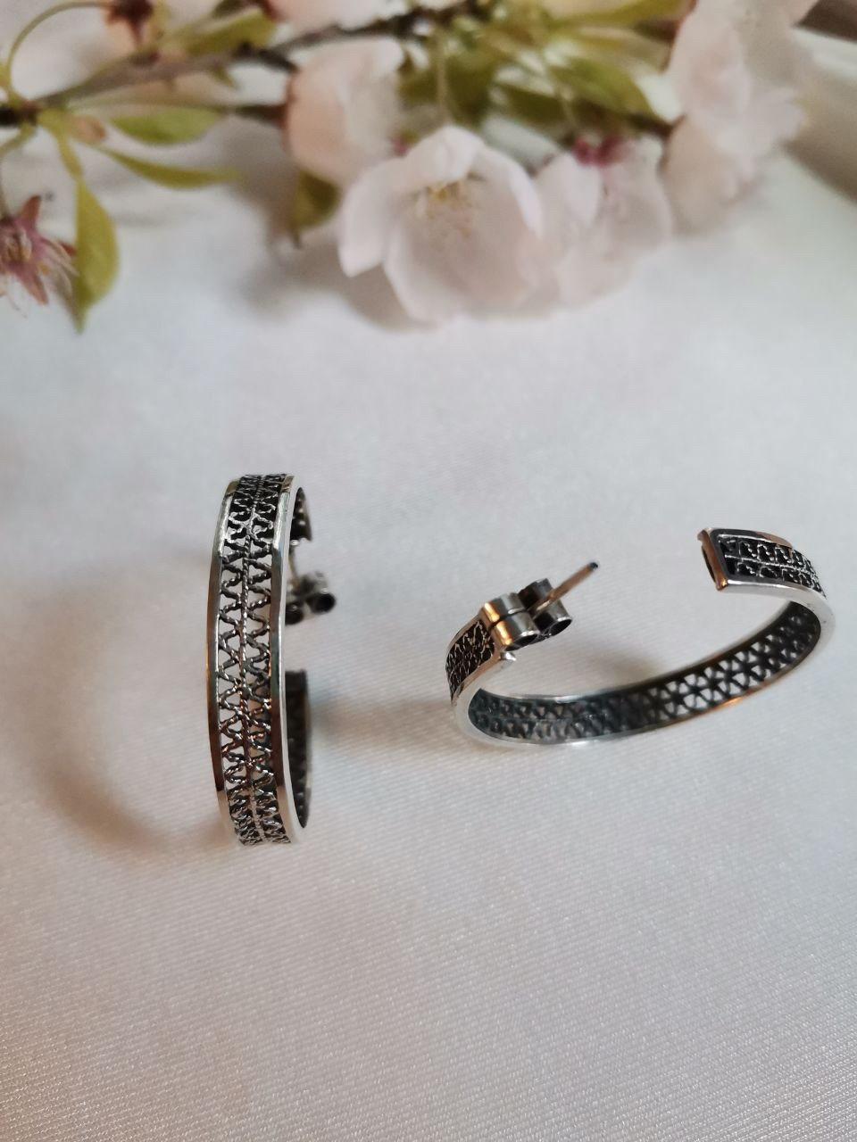 Be the first to review “Burnished Filigree 950 Silver Hoops”